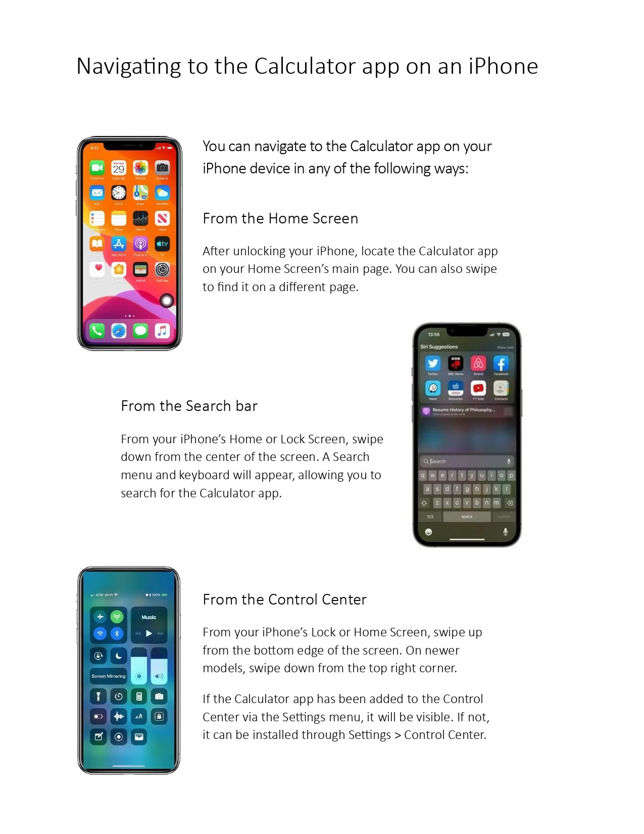 How to Navigate to the Calculator App on an iPhone A sample document intended to help a new iOS user navigate to the Calculator app on their device. Back